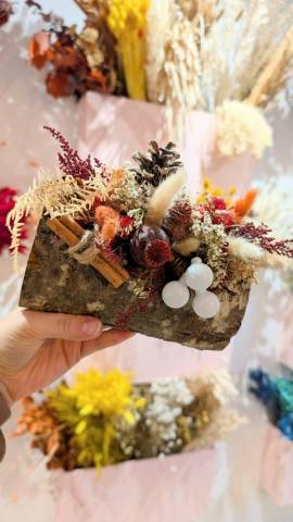 Offrez-vous un instant créatif et composez une bûche fleurie en fleurs séchées qui apportera une note naturelle, poétique et festive à votre décoration de Noël.
