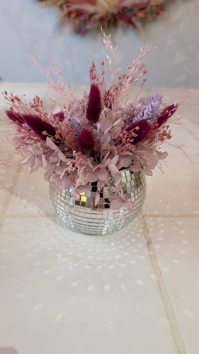 La boule disco est délicatement ornée de fleurs et végétaux naturels séchés et stabilisés, sélectionnés pour leur durabilité et leur harmonie de couleurs. Les fleurs conservent leur beauté dans le temps, sans entretien. La photo présentée est une représentation de la création : chaque boule disco fleurie est unique et peut présenter de légères variations.