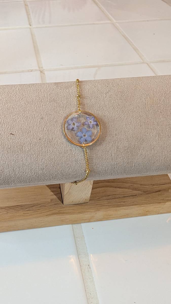 Ce bracelet en résine est composé de végétaux naturels séchés et figés dans de la résine, ainsi que d’acier inoxydable. Les végétaux, recouverts de résine transparente, conservent leur beauté naturelle au fil des années.