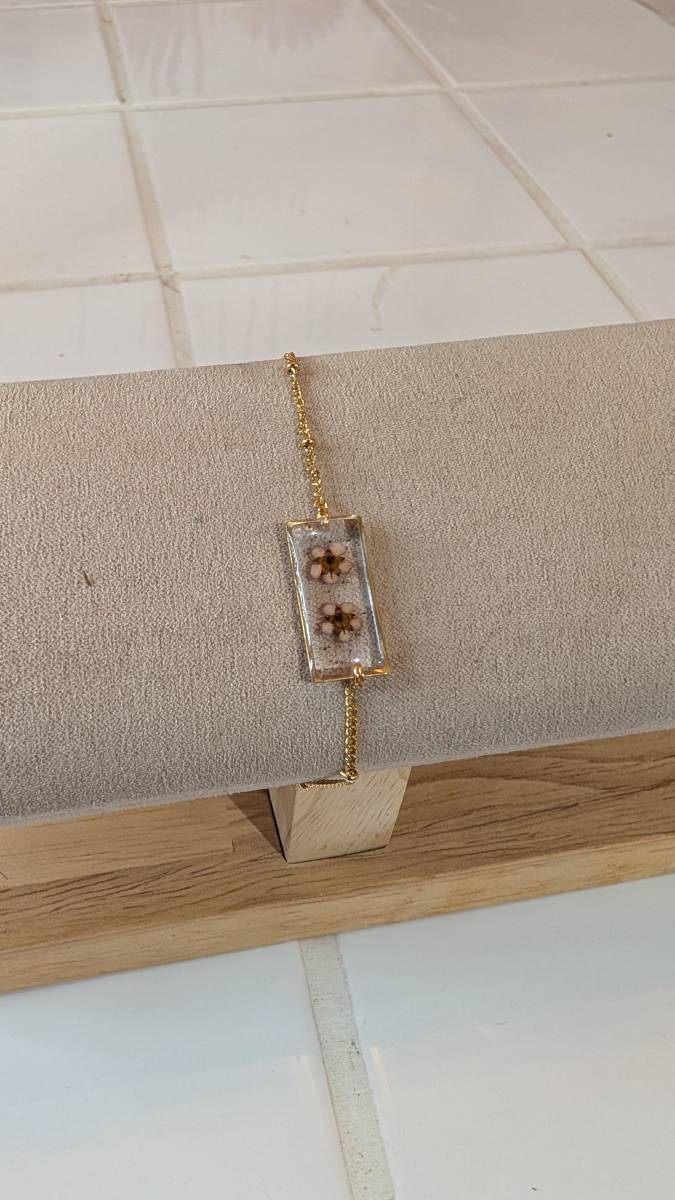 Ce bracelet en résine est composé de végétaux naturels séchés et figés dans de la résine, ainsi que d’acier inoxydable. Les végétaux, recouverts de résine transparente, conservent leur beauté naturelle au fil des années.