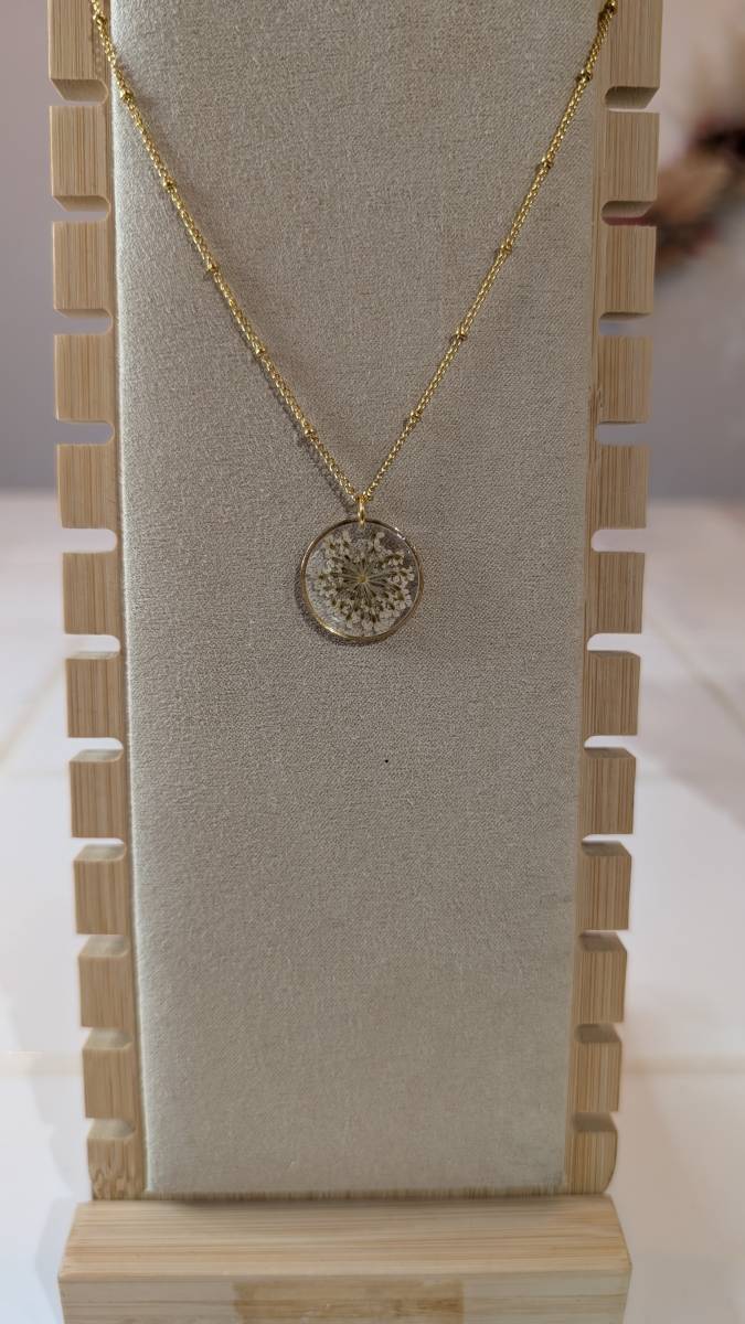 Ce collier en résine est composé de végétaux naturels séchés et figés dans de la résine, ainsi que d’acier inoxydable. Les végétaux, recouverts de résine transparente, conservent leur beauté naturelle pendant longtemps. Il est 100% fait main, imaginé et réalisé par mes soins dans mon atelier à Nantes, ce qui lui confère une esthétique unique !