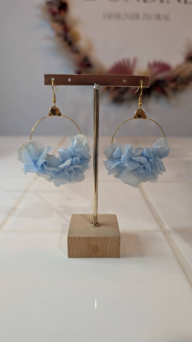 Cette paire de boucles est composée d’hortensia stabilisé et ainsi que d’acier inoxydable. Les hortensias sont des fleurs 100% naturelles qui ont subi un procédé de stabilisation pour conserver leur souplesse, ce qui leur permet de garder un rendu frais et naturel sans avoir besoin de les arroser.