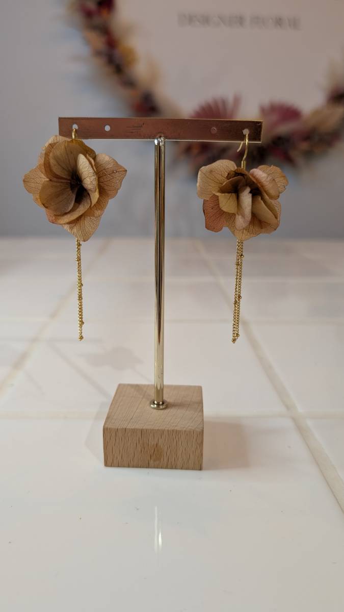 Cette paire de boucles est composée d’hortensia stabilisé et ainsi que d’acier inoxydable. Les hortensias sont des fleurs 100% naturelles qui ont subi un procédé de stabilisation pour conserver leur souplesse, ce qui leur permet de garder un rendu frais et naturel sans avoir besoin de les arroser.