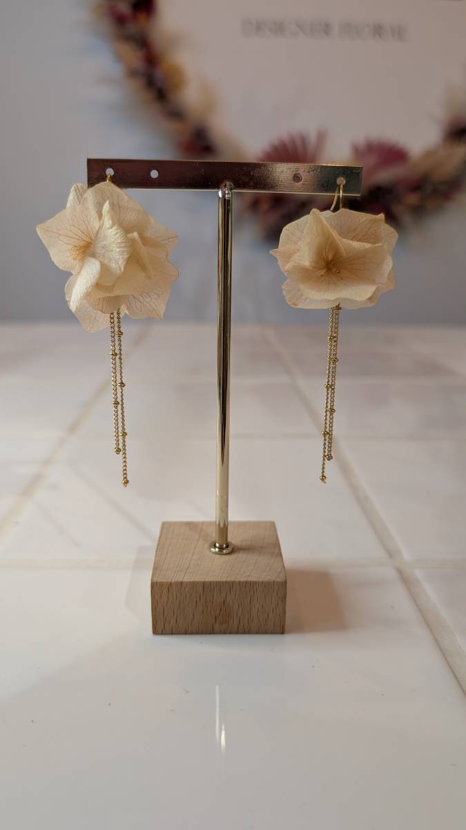 Cette paire de boucles est composée d’hortensia stabilisé et ainsi que d’acier inoxydable. Les hortensias sont des fleurs 100% naturelles qui ont subi un procédé de stabilisation pour conserver leur souplesse, ce qui leur permet de garder un rendu frais et naturel sans avoir besoin de les arroser.
